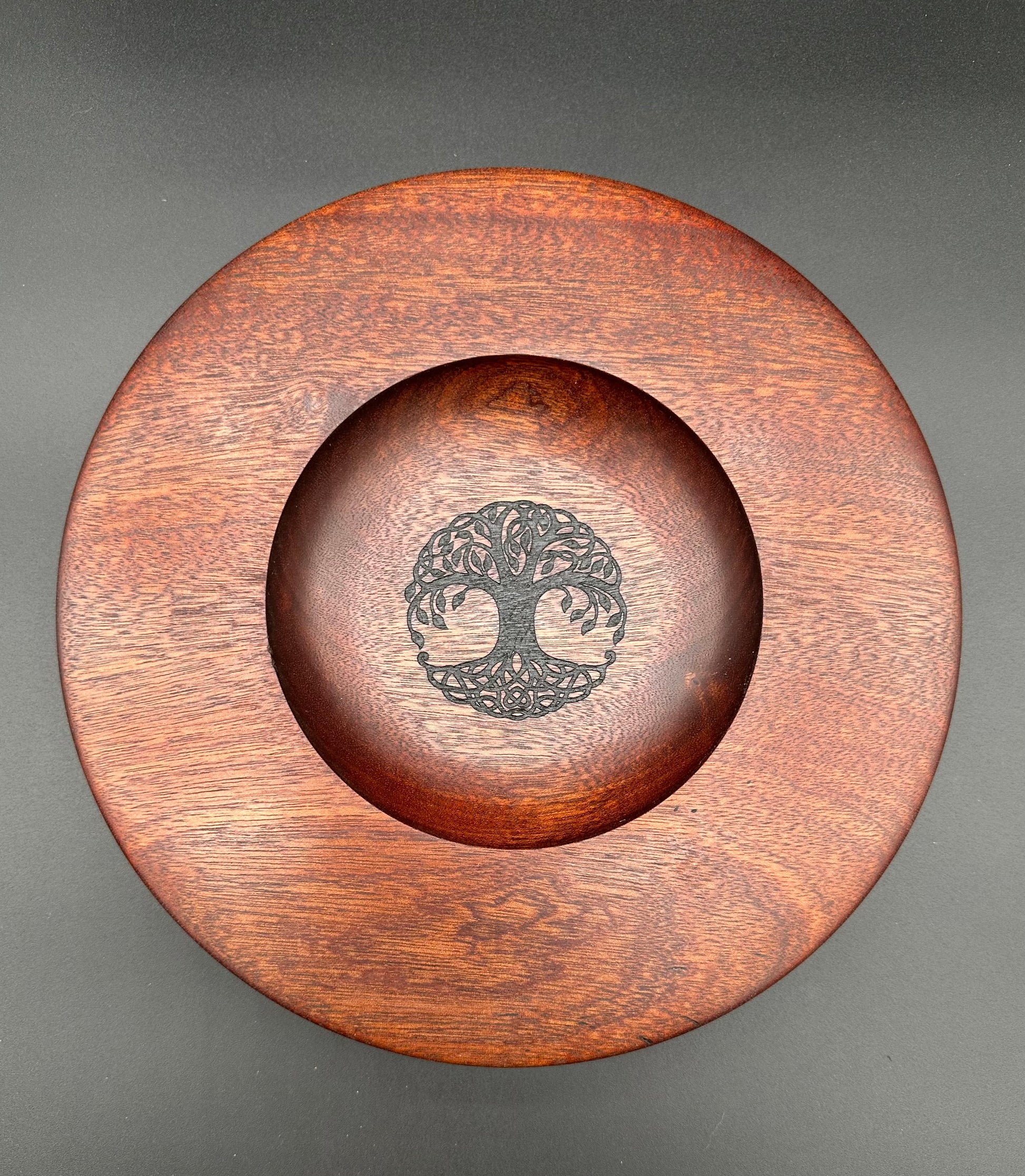 Hand turned beautiful sapele wood platter, mahogany family of woods, engraved with a Tree of Life with Celtic knot roots. 10.25 x 2"